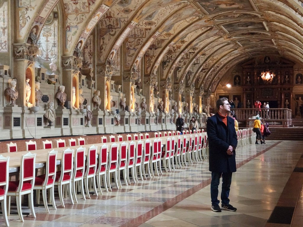 We stayed overnight at a local hotel which was only a 10-minute walk to Old Town. So we slept in till 9 AM before hitting the ground running. We grabbed breakfast at a coffee store, a chain but not Starbucks, before heading straight to the Residenz building. Originally the home of the house of Wittelsbach, the kings of Bavaria, it’s now a gorgeous museum. We started in the ancestral gallery, and William adored it. With paintings of the family members as far back as Charlemagne, although the family tree went back even further.