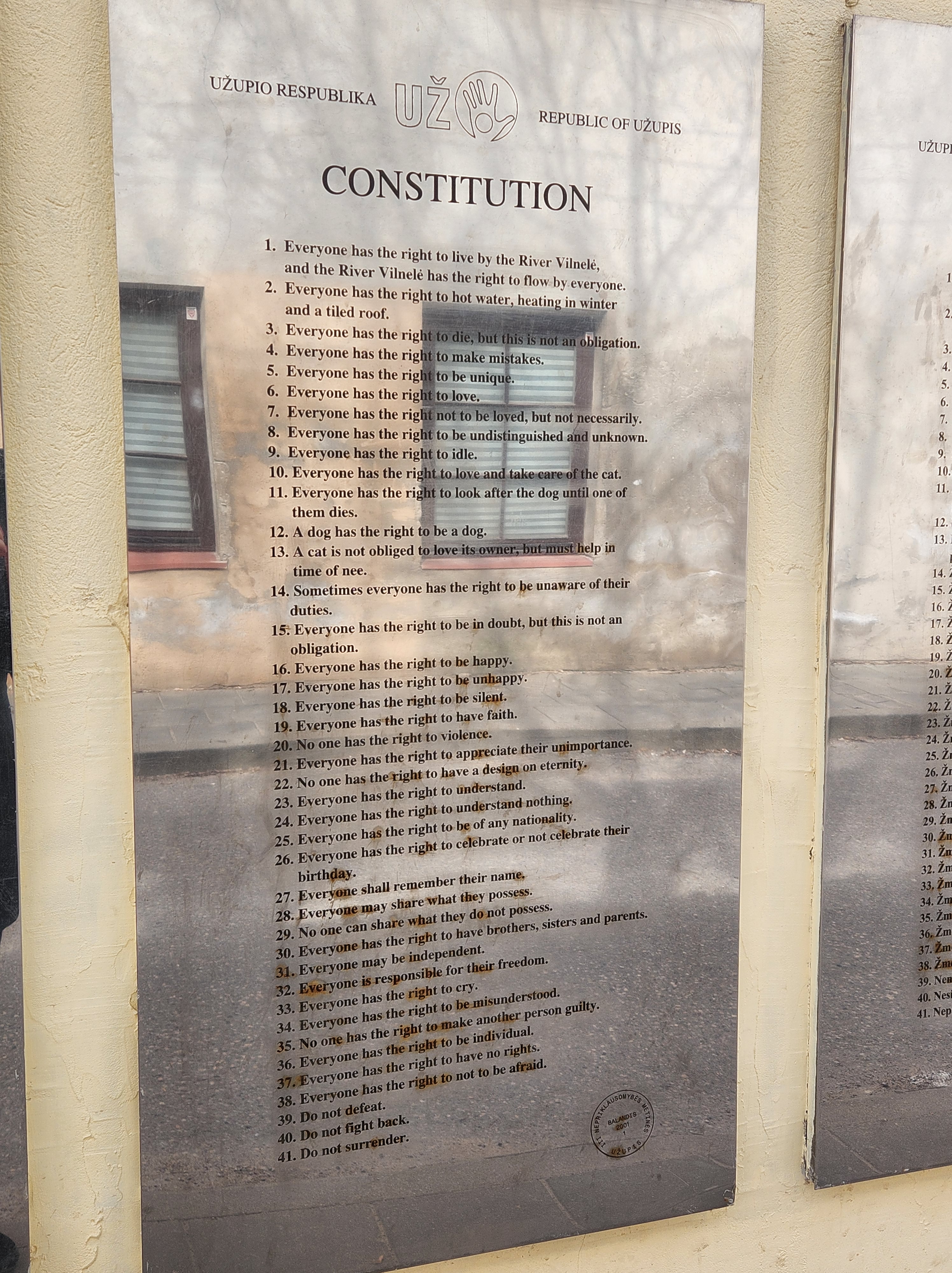 Following this historical dive, I visited Vilnius Cathedral, where I stayed for a service, marveling at its architectural splendor and the gorgeous art decorating every surface possible. Next, I wandered into the Republic of Uzupis, a bohemian artistic enclave. Founded in 1997, this district has been artistic for decades, even during the Soviet-era when artists squatted in abandoned buildings. A word of caution: while Uzupis offers passport stamps, it’s best for Americans to avoid them to prevent potential travel issues with CBP—a tip I received from a hostel employee.
