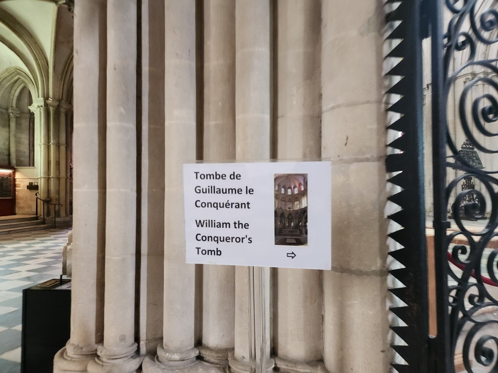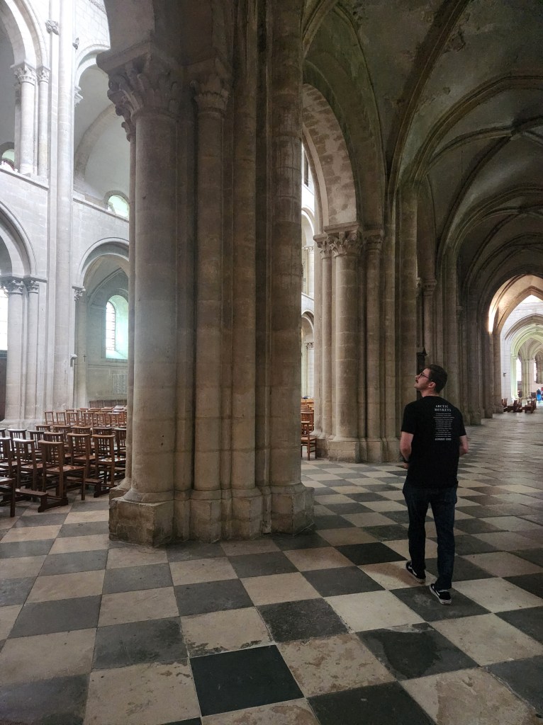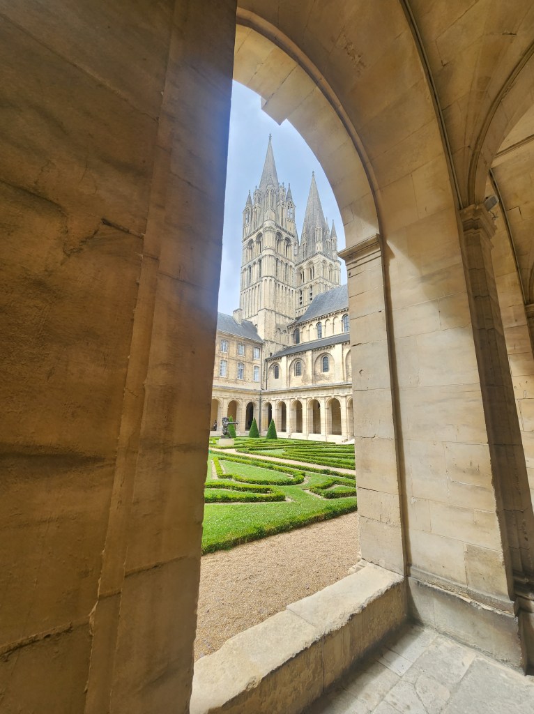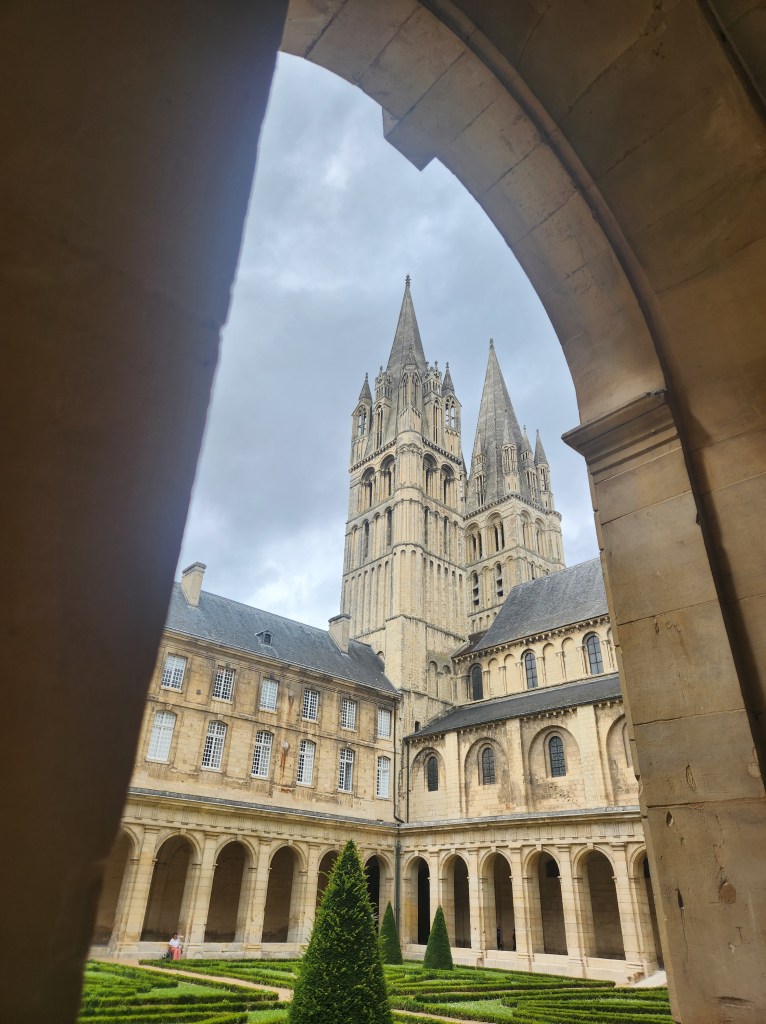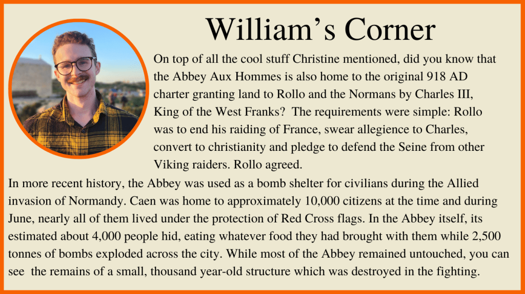 We left at 7 am on Friday, July 28, taking a train to Paris, then to Caen, arriving around 2 in the afternoon. We checked into our hotel and started exploring Caen. Our first stop was L’Abbaye-aux-Hommes. Founded by William and his wife, Matilda, to appease Pope Leo IX, who opposed their marriage, it was redesigned in the 1200s, destroyed in the 1500s, and rebuilt in the 1700s. William is still buried here, though most of his bones have been lost over time.