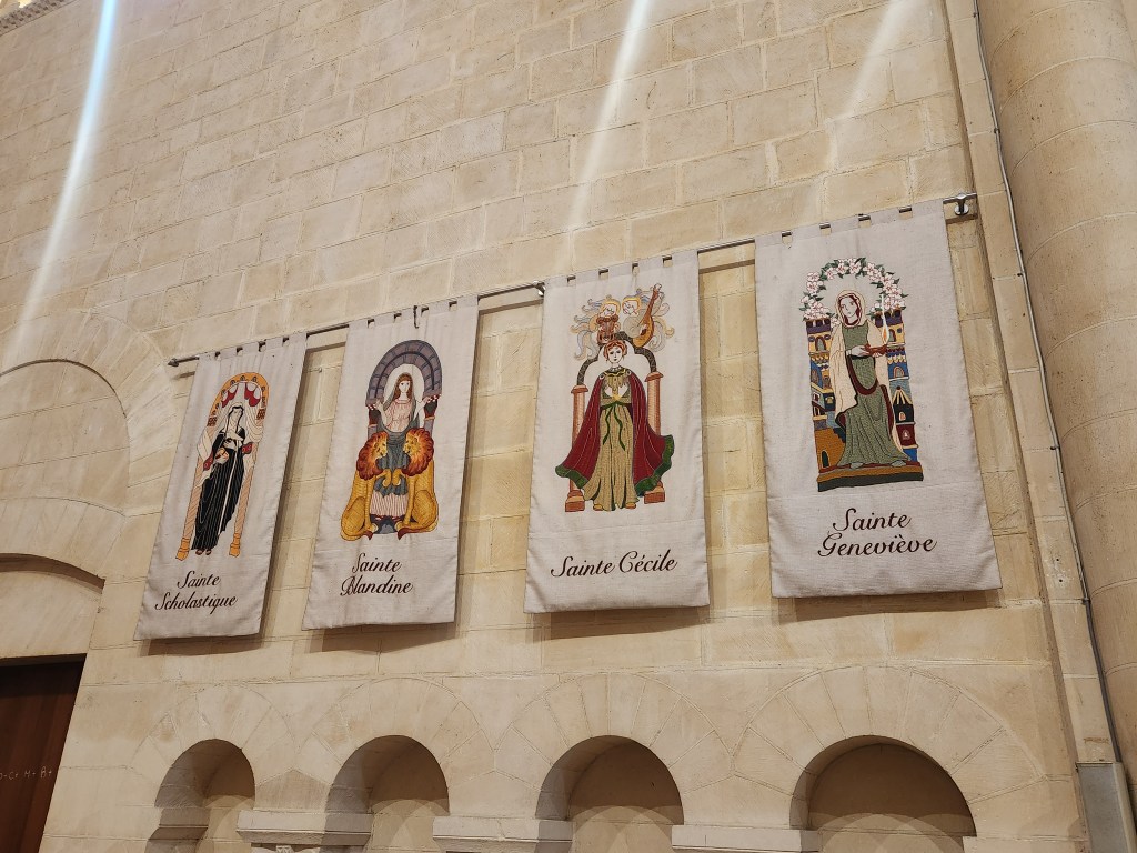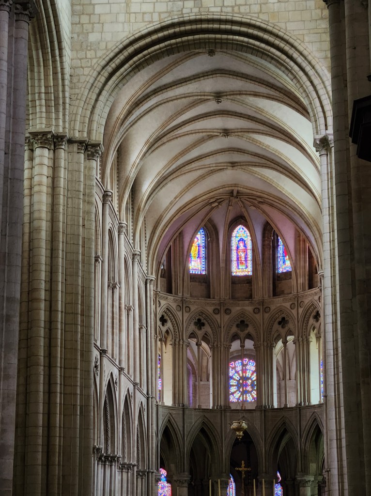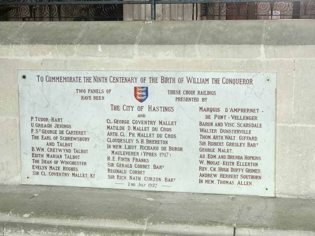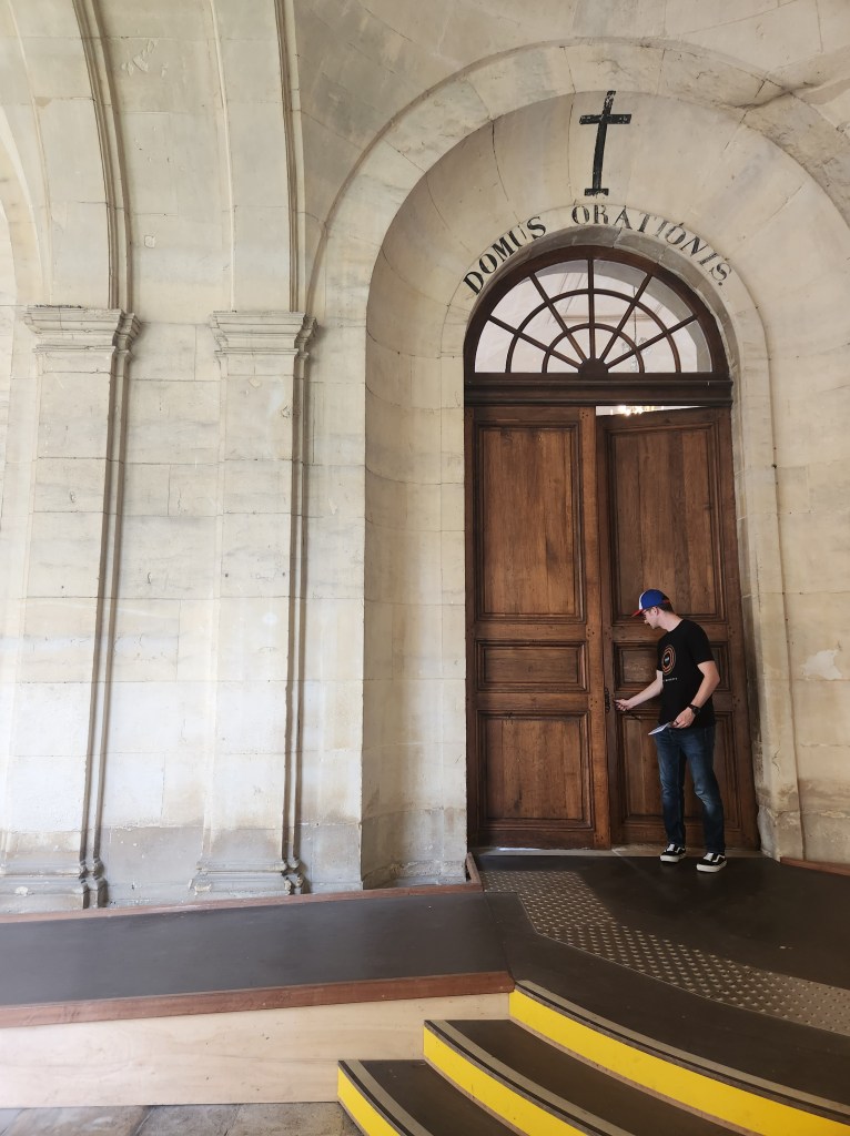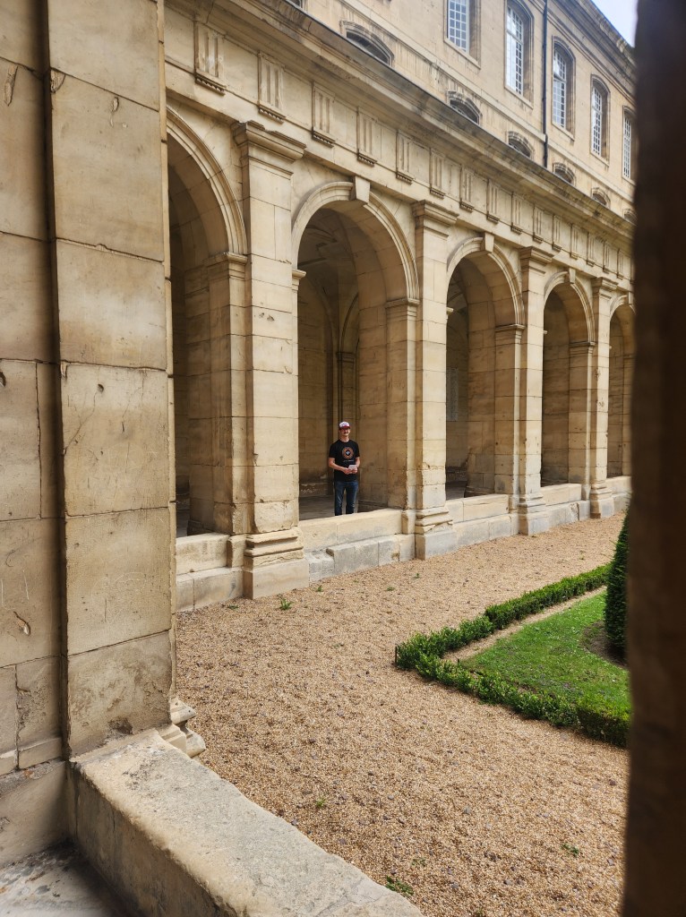 We left at 7 am on Friday, July 28, taking a train to Paris, then to Caen, arriving around 2 in the afternoon. We checked into our hotel and started exploring Caen. Our first stop was L’Abbaye-aux-Hommes. Founded by William and his wife, Matilda, to appease Pope Leo IX, who opposed their marriage, it was redesigned in the 1200s, destroyed in the 1500s, and rebuilt in the 1700s. William is still buried here, though most of his bones have been lost over time.